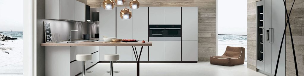 sont souvent intégrés dans la conception globale de la cuisine pour créer une apparence uniforme et élégante. Les comptoirs sont souvent en pierre naturelle ou en quartz, avec des armoires sans poignées pour une apparence plus épurée.